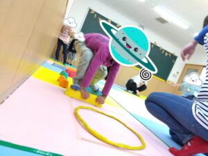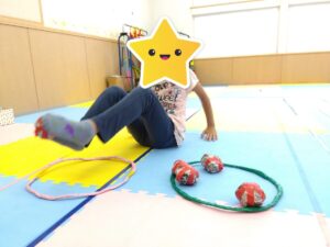 また、子どもたちは自分の体を思い通りに動かすことが難しかったようで、足の裏で掴むと言う事にみんな苦戦していました。