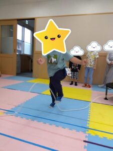 運動遊び時は、長縄跳びを元気に跳んだり