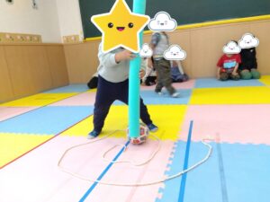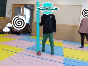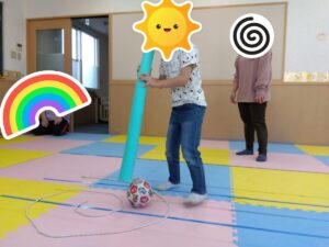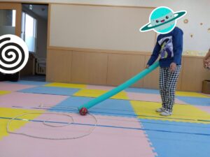 長い紐で作った渦の間にボールを置いて、棒を使ってボールを中心に転がしていく、という活動でした。
