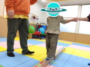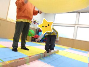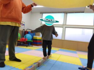 職員が持っているお布団(この日はタオルで行いました)の下をくぐりながら平均台を渡る、という活動です。