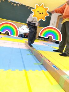 タオルが頭に当たらないようにの一言がドキドキ感を増し、平均台から落ちないようにタオルに当たらないようにの二つのルールが体の上下に緊張感を伝えることで、楽しさが増しているようでした😁