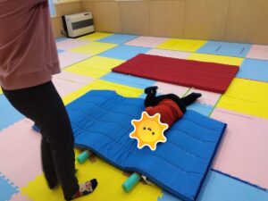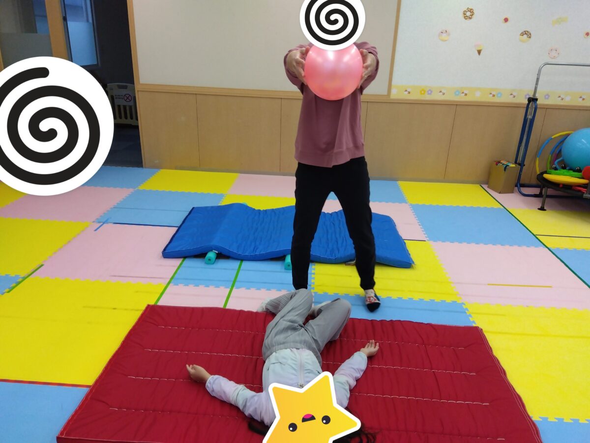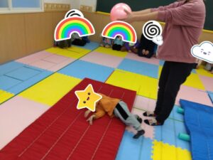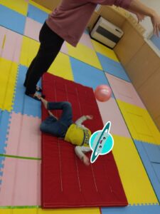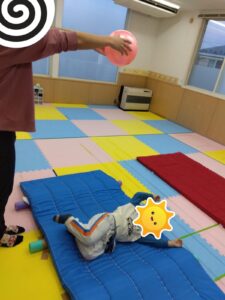 マットの上で寝そべった状態で、上から落ちてくるボールを転がりながら避けるという活動です。
