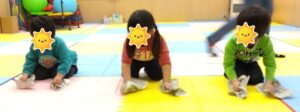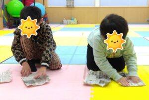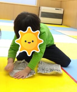 スタートの合図が聞こえたら、両手を同時に動かし、新聞紙を丸めていく活動です‼️