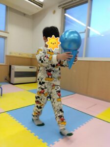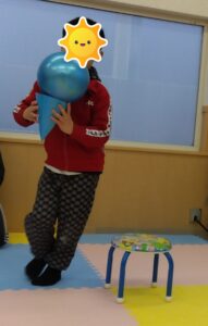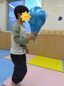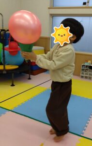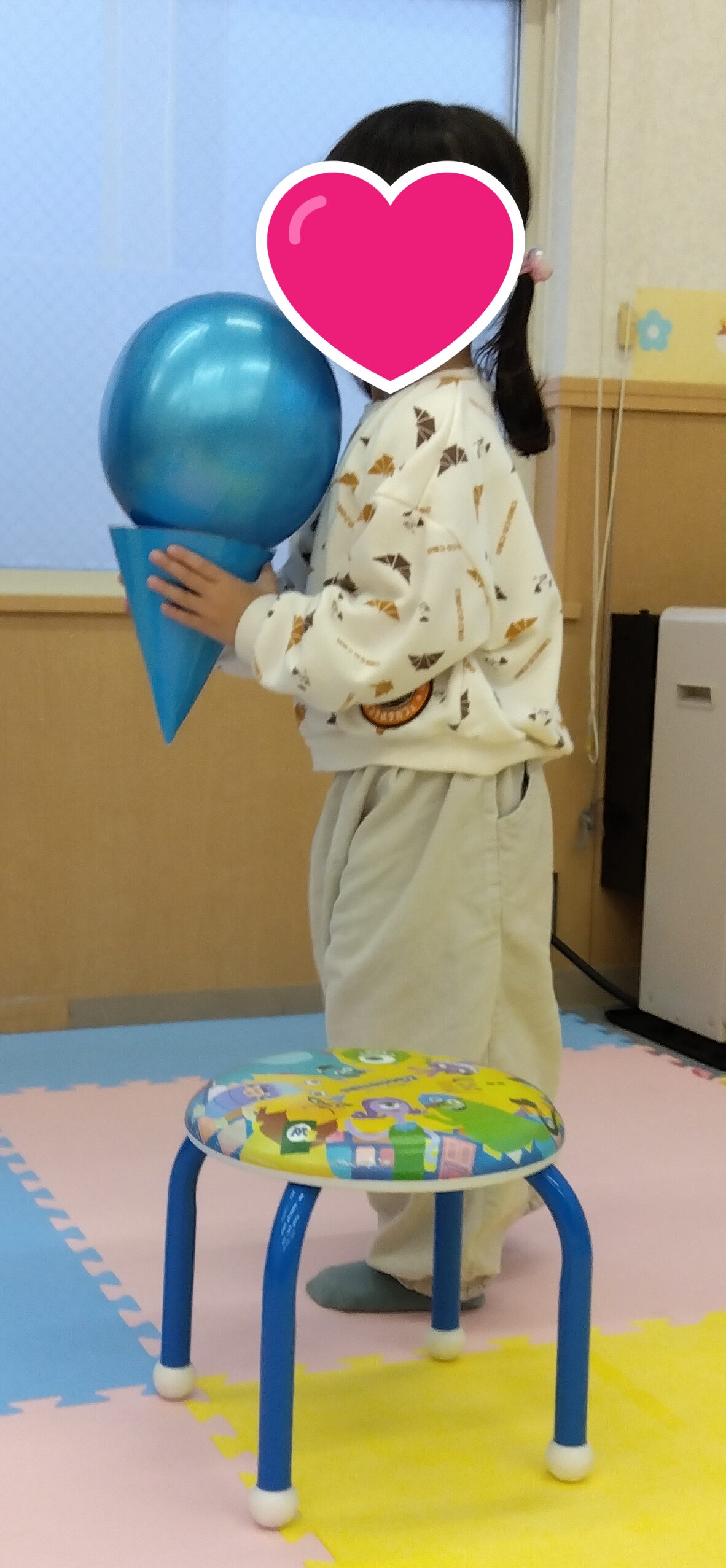 三角コーンに丸いものをのせて落とさないようにリレーをしていく活動になっています!