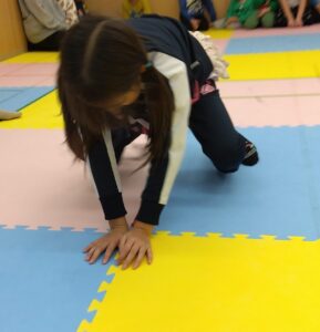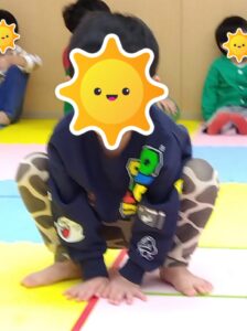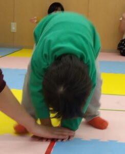 両手を着きながらジャンプをすることが難しい子は、手を上から添えて抑えてあげたり