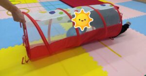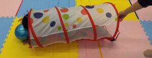 ボールが先に転がって行かないように抑えながらトンネルとくぐって