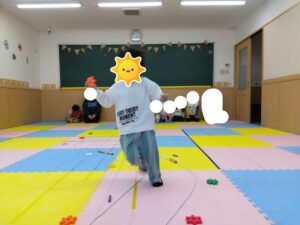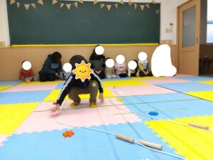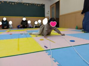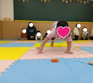 くま歩きが少し苦手なお友だちは犬歩きや、しゃがみ歩きで進んでみました!