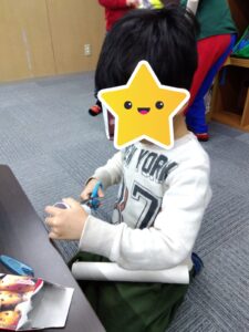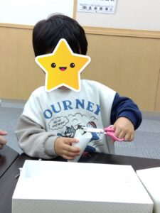 思い思いにハサミをいれたり、テープでくっつけたりし想像力を刺激する楽しい遊びになりました!!