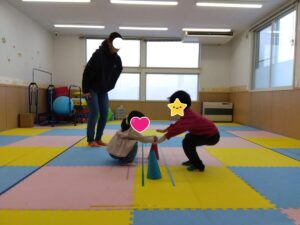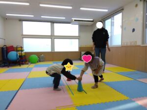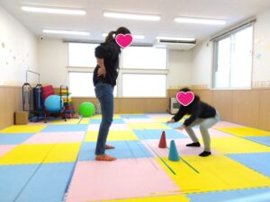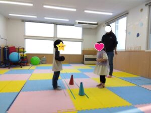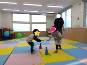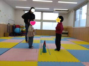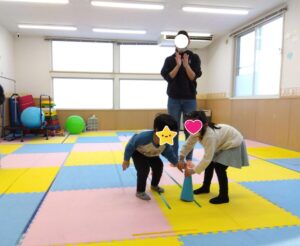 指示通りの順番で体をタッチして、最後は早く赤コーンにタッチ✋