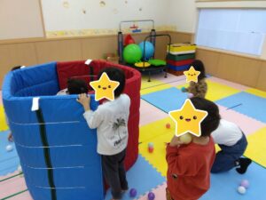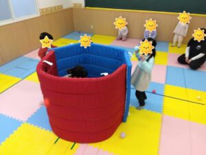 子どもたちは、煙突(マット)の中にボールを入れていきます🏐