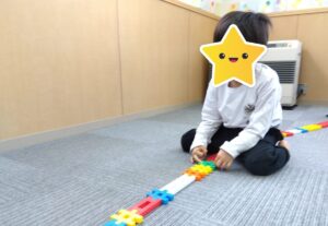 お友だちの真似っこをして、ブロックをたくさんつなげ、