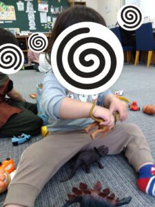 おもちゃの恐竜同士でお話させてみたり、